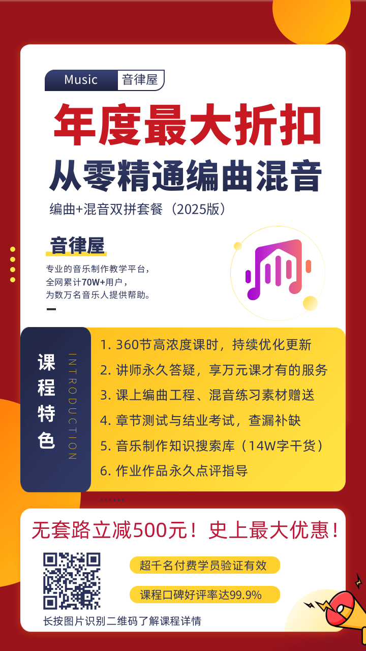 在这个课程质量参差不齐的时代,我们始终坚持不急功近利、不盲目追求数量,只为呈现高品质、系统化的教学内容。如果你希望在音乐编曲和混音的道路上少走弯路,拥有权威系统的教学,欢迎了解: